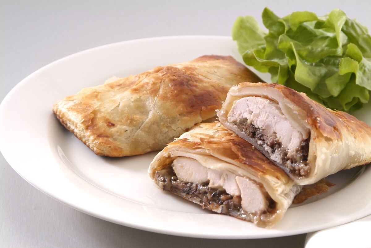 Puff Pastry parcels wrapped with chicken breast fillet , tasty cheese, leg ham and sliced mushrooms.
